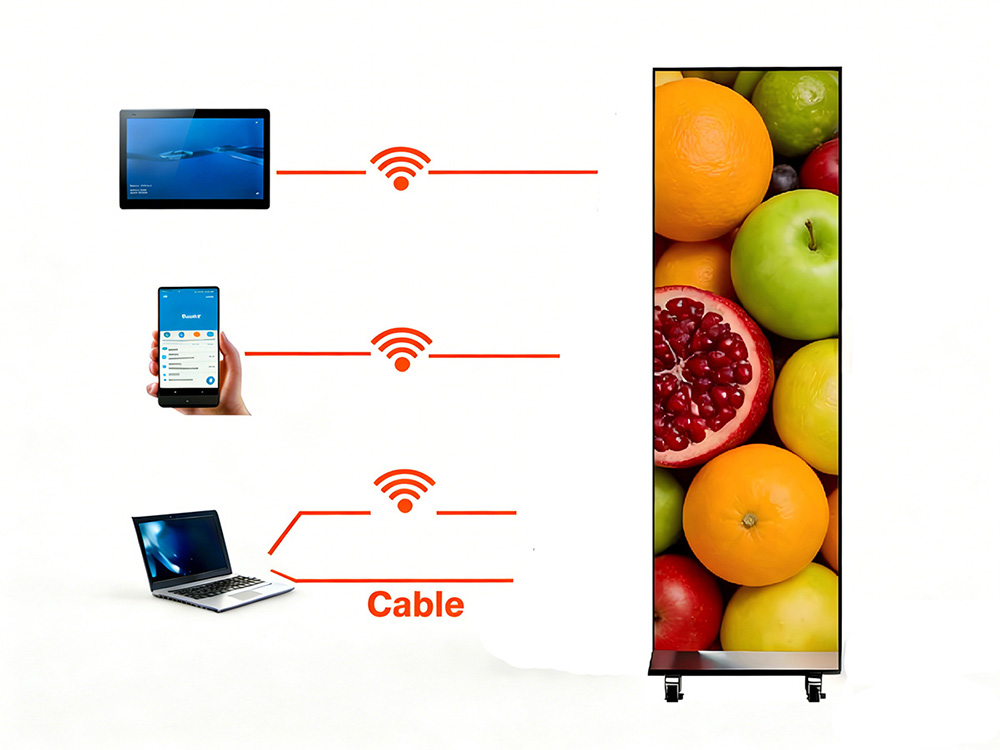 This LED Poster screen supports both synchronous and asynchronous control systems. Content can be updated in real-time and published across platforms via iPad, mobile phone, PC, or laptop, using either USB or Wi-Fi connection. It is fully compatible with both iOS and Android devices for operation and also features a built-in media player for standalone content storage and playback.